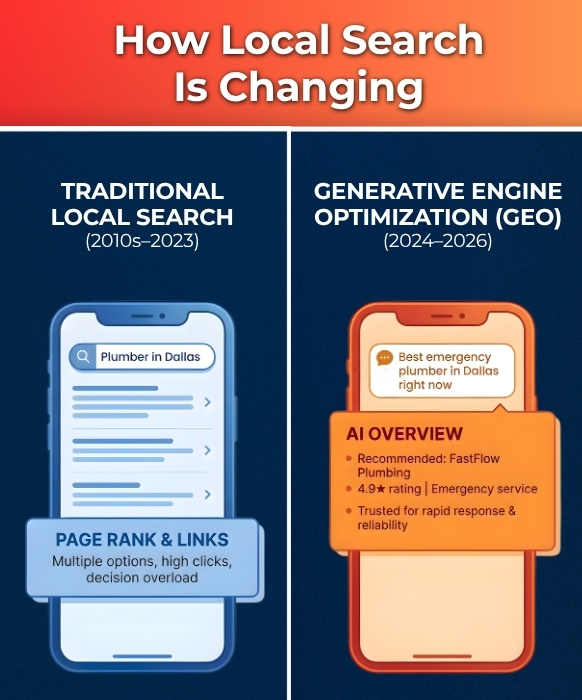 This article explains how Generative Engine Optimization (GEO) is reshaping local discovery and what businesses must do to stay visible when AI assistants start recommending services directly.